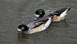 There are three extant species: the Eurasian wigeon (Mareca penelope), the American wigeon (M. americana) and the Chiloé wigeon (M. sibilatrix). A fourth species, the Amsterdam wigeon (Mareca marecula), became extinct in the 19th century. The wigeons' closest relatives, forming with them the genus Mareca, are the gadwall and the falcated duck.[1][2]