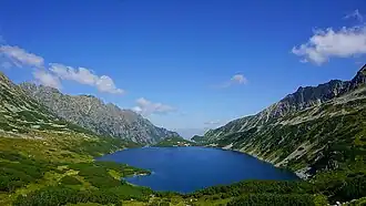 ![]() Wielki Staw Polski seen from the trail to Szpiglasowa Przełęcz. | |