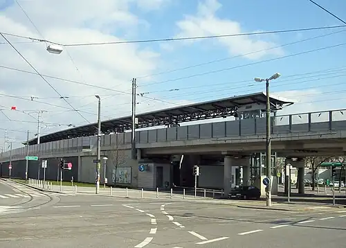Wien Geiselbergstraße is a railway station serving Simmering, the eleventh district of Vienna.[1][2] It is located on an elevated s-curve and was built during the 2002 relocation of parts of the Aspangbahn.[3]