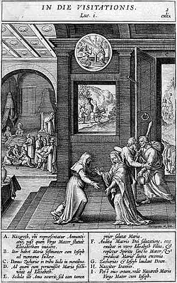 Their association with the Jesuits began with the illustrations for the Adnotationes et Meditationes in Evangelia, a project initiated by the order's founder, St. Ignatius Loyola before his death in 1556. He had asked the literary Jesuit Jerome Nadal to prepare the text, and 154 drawings had been produced by various artists, mostly Italian. Plantin had agreed to publish the work, but with the disruption of the Spanish Fury of 1576, had not done so by his death. After attempting to find engravers elsewhere, the Jesuits, in the person of Fr Ferdinand Ximenez (recipient of the famous character reference for the brothers mentioned above), took the brothers on.[10] The prints were finally published in a separate volume from the text in 1593, the Evangelicae Historiae Imagines ("Pictures of the Gospel Stories") and were still being reprinted in the 18th century. They were intended as models of faithful depictions of the incidents of the Gospels, and partly as a Counter Reformation riposte to Protestant criticisms of Catholic iconographical tradition. The apparent setting of most interior scenes in a wealthy Antwerp merchant's house does not contribute to the desired effect in modern eyes. Among copies was a version made by Jesuit missionaries in China in woodblock print form,[11] and editions presented to the Emperors of Ethiopia had a considerable influence on the iconography of local artists.[12] Further work for the Jesuits followed.[13] Hieronymus in particular came to specialize in small religious scenes.
