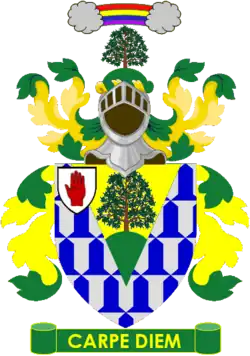 | Shield | Vair on a pile Or a mount in base Vert thereon a mountain ash tree Proper. |