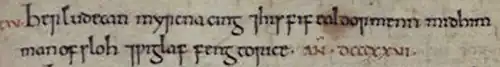 The Anglo-Saxon Chronicle records Wiglaf's accession in the entry for 827 (erroneously recorded under the year 825).[20] The entry reads "Her Ludecan Myrcna cing 7 his fif ealdormenn mid him man ofsloh, 7 Wiglaf feng to rice",[21] which means "Here Ludeca, King of Mercia, was killed, and his five ealdormen with him, and Wiglaf succeeded to the kingdom". In 829, Ecgberht of Wessex successfully invaded Mercia and drove Wiglaf from his throne.[22] The immediate consequence of Ecgberht's defeat of Beornwulf in 825 at the battle of Ellendun had been the loss of Mercian control over the south-eastern kingdoms of Kent, Sussex, Essex and East Anglia; Beornwulf's and Ludeca's disastrous military expeditions against East Anglia in 826 and 827 also confirmed Mercia's loss of control of that kingdom.[6][23] Ecgberht's defeat of Wiglaf in 829 completed his domination of southern England,[6] and Ecgberht went on to receive the submission of Eanred of Northumbria at Dore, on the northern border of Mercia, later that year.[24] These events led the anonymous scribe who wrote the Anglo-Saxon Chronicle to describe Ecgberht as the eighth bretwalda, or 'Ruler of Britain'.[22]