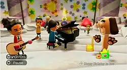 Wii Music focuses on creating arrangements of existing songs by controlling the members of an on-screen band. In order to do so, players choose from a selection of musical instruments that are played by mimicking the required actions using the Wii Remote and Nunchuk. Unlike other music games, such as Guitar Hero and Rock Band, players are not scored on their performance and are encouraged to experiment with different ways to play various songs.[1] The game has been advertised by Nintendo as a means to "bring the joy and creativity of musicianship to [one's] home without expensive music lessons."[2]