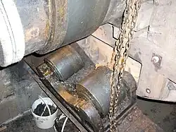 The Wijnsermolen is what the Dutch describe as an "achtkante grondzeiler". It is a smock mill without a stage, the sails reaching almost to the ground. The brick base is one storey high with a three-storey smock on top. Both smock and cap are thatched. The mill is winded by tailpole and winch. The four common sails with Fok system have a span of 19.50 metres (64 ft 0 in) and are carried on a cast-iron windshaft cast by foundry De Prins van Oranje in 1889 as number 1360. The front bearing is of cast iron with bronze liner instead of the stone bearings that are more commonly found in the Netherlands. The windshaft carries the brake wheel, which has 55 cogs. This drives the wallower (28 cogs) at the top of the upright shaft. At the lower end of the upright shaft the crown wheel (42 cogs) drives the steel Archimedes' screw via a gear wheel with 39 cogs. The upper bearing of the screw axle is a rare Dekker bearing, consisting of two rollers that support the axle. The Archimedes' screw diameter is 1.05 metres (3 ft 5 in) diameter. It is inclined at 16½°. Each revolution of the Archimedes' screw can lift 956 litres (210 imp gal) of water.[1]
