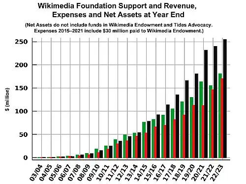 The foundation finances itself mainly through millions of small donations from readers and editors, collected through email campaigns and annual fundraising banners placed on Wikipedia and its sister projects.[12] These are complemented by grants from philanthropic organizations and tech companies, and starting in 2022, by services income from Wikimedia Enterprise. As of 2023, it has employed over 700 staff and contractors, with net assets of $255 million and an endowment which has surpassed $100 million.