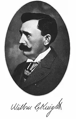 Knight was born at Rochelle, Illinois from where his father David moved to farm in Blue Springs, Nebraska. He then went to the University of Nebraska, and graduated in 1886. He briefly considered studying botany. He then worked as an assayer at Swan Testing and Sampling Company from 1887 in Cheyenne, he became superintendent of mines in 1888 for Colorado and Wyoming. He also studied for his master's degree which he received in 1893. He became state geologist for Wyoming in 1898 and received a doctorate in 1901. He became chair of geology and mining engineering at the University of Wyoming in 1893 and was involved in establishing the department and the teaching of geology in the state. He also founded the geological museum for which he made collections himself while also making use of the services of William Harlow Reed.[1][2] In 1900 he produced one of the earliest geological maps of Wyoming.[3] Knight discovered fossil elephants in Wyoming in 1903[4] and estimated the Cenozoic Era to have lasted around four million years.[5] He was a pioneer of the use of photography in paleontology. He often led geological excursions for his students as well as for interested people. In 1899 he took a party of about 100 fossil collectors around Como Bluff and the Grand Canyon. Free transportation was provided by the Union Pacific Railroad.[6] In 1902, he published one of his last works being on the birds of Wyoming.[7][8]