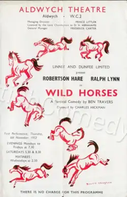 Wild Horses is a 1952 stage farce by the British writer Ben Travers. It was first performed at the Manchester Opera House in August 1952 before moving on to the Aldwych Theatre in the West End, lasting for 179 performances between November 1952 and April 1953.[1] The plot revolves around the sale of a valuable painting. It starred Robertson Hare and Ralph Lynn who had previously appeared together in the Aldwych farces, written by Travers in the 1920s and 1930s. Other members of the cast included Robin Hunter, Cyril Smith, Colin Douglas, Frank Thornton, Joan Haythorne and Ruth Maitland.[2]