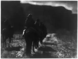 Wild westers educated the American and European public about Native American history and culture. The Wild Wester community was a diverse group, including U.S. Army Indian Scouts from the Great Sioux War; famous prisoners of war such as Lakota Chief Sitting Bull, Ghost Dancers Kicking Bear and Short Bull; Apache Chief Geronimo; Carlisle Indian School students Luther Standing Bear and Frank C. Goings; and Chiefs Iron Tail and Red Shirt, who became international celebrities. Chief Iron Tail was the most famous Native American of his day; a popular subject for professional photographers, he had his image circulated across the continents.[22] Chief Red Shirt was popular with journalists and newspapers and was the most quoted Wild Wester celebrity.[23] Early dime novels, Wild West shows and Golden Age photographers, portraitists and movie-makers created the theatrical image and portrayal of the Lakota people as the iconic American Indian mounted warrior. This popular perception in the United States and Europe was created by Lakota performers in their historic reenactments of the Sioux Wars; demonstrations of Lakota horse culture and equestrian skills; and ceremonial dancing, cooking and music.[24]