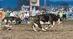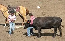 Wild cow milking is a rodeo event seen at mainstream and ranch rodeos. A team-based competition, the goal is to catch and milk a "wild" cow (a semi-feral animal that is not used to being milked by people, usually of a beef cattle breed) in as short a time as possible.[1] The competition dates back at least to the early 20th century, with competitions at the Cheyenne Frontier Days rodeo photographed as far back as 1924.[2]