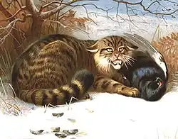 Because of its habit of living in areas with rocks and tall trees for refuge, dense thickets and abandoned burrows, wildcats have few natural predators. In Central Europe, many kittens are killed by European pine marten (Martes martes), and there is at least one account of an adult wildcat being killed and eaten. Competitors include the golden jackal (Canis aureus), red fox, marten, and other predators.[43] In the steppe regions of Europe and Asia, village dogs constitute serious enemies of wildcats, along with the much larger Eurasian lynx, one of the rare habitual predators of healthy adult wildcats. In Tajikistan, the grey wolf (Canis lupus) is the most serious competitor, having been observed to destroy cat burrows. Birds of prey, including Eurasian eagle-owl (Bubo bubo) and saker falcon (Falco cherrug), have been recorded to kill wildcat kittens.[44] Golden eagle (Aquila chrysaetos) are known to hunt both adults and kittens.[45] Seton Gordon recorded an instance where a wildcat fought a golden eagle, resulting in the deaths of both combatants.[46] In Africa, wildcats are occasionally killed and eaten by Central African rock python (Python sebae)[47] and martial eagle (Polemaetus bellicosus).[48]