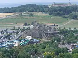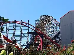 From 2022 to 2023, the former Wildcat was converted into a steel roller coaster manufactured by RMC and designed by Joe Draves.[44] The ride contains four inversions and reuses most of the original wooden roller coaster's support structure. This roller coaster is 3,510 feet (1,070 m) long, with a lift hill rising 140 feet (43 m) and a first drop of 135 feet (41 m).[23][44][45][1] The expansion of the lift hill required the construction of a new truss.[44] The ride has an 82-degree drop off the lift hill, reaching a maximum speed of 62 miles per hour (100 km/h).[45] The ride features the world's largest underflip inversion, which Hersheypark officials described as ascending upwards before the train twists counterclockwise into a 270° roll before descending down.[23][46] One cycle of the ride lasts 2 minutes and 36 seconds.[45][1] The roller coaster contains red track, as well as black supports made of wood and steel.[27] The ride's station has a gable roof, which was intended to be reminiscent of the Wild Cat roller coaster that closed in 1945.[44]