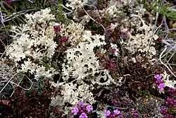 Much of the northern part of the country is marshy or tundra, with the vegetation being predominantly mosses, lichens and sedges. Typical is Iceland moss, a lichen which grows abundantly forming mats on the tundras and mountain slopes and which can provide "famine food" in times of necessity.[7] Sedges and grasses dominate the vascular plants, with 53 species of the former and 47 of the latter. Of dicotyledonous plants, the commonest family is the Asteraceae (daisy family), followed by the Caryophyllaceae (carnation family).[2] There are around 560 species of bryophyte (mosses and liverworts), 550 species of lichen and 1,200 species of fungi, with both lichen and fungi being similar to those found in Scandinavia.[2]