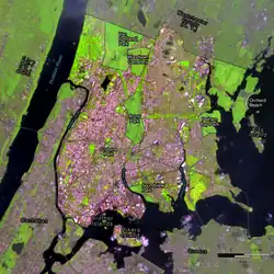 The New York City borough of the Bronx is one of the most densely populated places in the United States, but is home to a wide range of wildlife. The borough has a land area of 42 sq mi (110 km2),[1] of which 24 percent is parkland.[2] Most of the open area (Van Cortlandt Park, Woodlawn Cemetery, Bronx Park, and Pelham Bay Park) is in the northern section of the borough, adjacent to Westchester County, allowing easy migration of animals from the mainland.[3] The tree canopy of the Bronx cover 25% of the land area, hosting a wide range of avian species.[4]