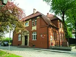 - Former presbytery at 7 Wileńska Street – built between 1909 and 1911, designed by Jürgen Kröger in a semi-modernist style.[8] It is a freestanding,[17] two-story building on a rectangular plan,[8][17] made of red brick with plastered decorative elements.[8] The front façade features a decorative portal, semicircularly closed, flanked by Ionic columns with capitals. Above the portal is an oculus. In front of the building stands Racibórz's only remaining old gas lantern (now converted to electric).[8][17] The side façade features an avant-corps,[8] and the building is topped with a mansard roof.[8][17]