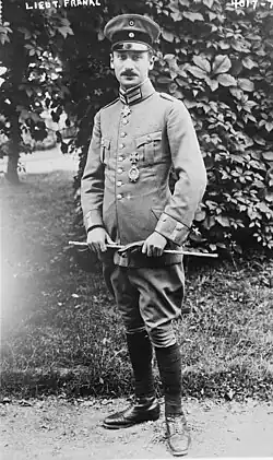 It took exactly eight months for his second triumph. On 10 January 1916, while flying a Fokker Eindecker with KEK Vaux, he downed another Voisin; this one was armed with a 37mm Hotchkiss cannon.[3] By 1 February, his victory total stood at four. Three months later, on 4 May, he became an ace. On 16 May, he was promoted from Vizefeldwebel into the officer's ranks as a Leutnant. He scored once more on 21 May. He was awarded the Knight's Cross with Swords of the Royal House Order of Hohenzollern during late May, followed by the Hanseatic Cross.[2] By this time, Frankl was one of only eight aces in the German flying service.[6] Frankl's gallantry earned him the Pour le Mérite after his eighth confirmed victory; the Blue Max was awarded on 16 July 1916.[2]