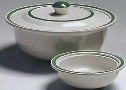 The focus of Kåge's early ceramic designs, as of much of Swedish design of this period was on practical solutions to social issues, an example of which was his Praktika (1933), a simply designed and stackable set of tableware aimed at working-class families.[5] Praktika was a commercial failure, as the intended buyers preferred more traditional and ornate products.[6]