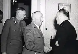 Following Schmidt's death under uncertain circumstances in June 1943, Heinrich Himmler and Martin Bormann agreed to appoint Ritterbusch as his successor as Commissioner-General for Special Duties for the Netherlands. Accordingly, Adolf Hitler appointed Ritterbusch to the position and also as Head of the Netherlands Division of the NSDAP.[6] Ritterbusch was thus directly subordinated to Reichskommissar Arthur Seyss-Inquart as one of his four assistants. After Seyss-Inquart and SS representative Hanns Rauter, Ritterbusch was the third most important NS functionary in the occupation administration of the Netherlands. During his time in office, Ritterbusch's highest rank in the hierarchy of the NSDAP was Hauptdienstleiter ("Head Service Leader").[7]