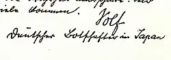 Between then and 1920, he served as Vice President of the Deutsche Kolonialgesellschaft. From 1920 to 1928, he served as the German chargé d'affaires[10] and then ambassador to Japan; his tenure proved to be fruitful, as he was instrumental in restoring good relations between the two World War I enemies, which culminated in the signing of the German-Japanese Treaty of 1927. On Solf's return to Germany and his retirement from government service, he became the Chairman of the Board of the Deutsches Ausland-Institut based in Stuttgart.