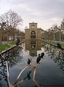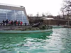 1949 saw a reopening ceremony, featuring an aquarium. The following year, in 1950, a bird exhibit featuring cassowaries, pheasant, rheas, ostriches, and birds of paradise was unveiled.[13] This exhibition was followed by Animals of the German Fairy Tale the same year, with such animals as brown bears, lions, and various reptiles, including anacondas, pythons, giant turtles, and crocodiles.[14] Another exhibit, Animals of the Plains of Africa, once again featured lions and crocodiles, as well as various antelopes (such as waterbuck), zebras, wildebeest, and giraffes.[15] An Indian jungle-inspired exhibit was the most successful exhibit to-date in the entire history of Wilhelma; the display included Asian elephants, Bengal tigers, Indian leopards, Asiatic black bears, and macaques.[16] The state of Baden-Württemberg's Ministry of Finances ordered the animals from that exhibit removed; however, the order was never carried out.[15] 1965 saw the founding of the Association of Friends and Supporters of Wilhelma.[17]