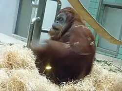 The old Ape House, opened in 1973, was one of the most modern of its kind at the time. The building's design, since copied by numerous other zoos and again mimicked in the new ape house, was characterized by features like the carousel-style design of the enclosure and the tiles that line them and the specialized support disks that allowed increased force distribution.[28] The last two chimpanzees at Wilhelma were acquired in the summer of 2010 due to European Endangered Species Programme drive begun at Veszprém.[29] Since the opening of the new ape house, the old house has been used exclusively for the zoo's orangutans. In 2011, it was announced that the zoo wished to remodel the enclosures of the orangutans, lutungs and gibbons.