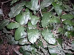 Wilkiea hugeliana is a tall shrub or small tree, typically 1–8 m (3 ft 3 in – 26 ft 3 in) high with a dbh of up to 10 cm (3.9 in).[3][4] Its leaves are arranged in opposite pairs, egg-shaped, oblong to narrowly elliptic, 60–150 mm (2.4–5.9 in) long and 10–80 mm (0.39–3.15 in) wide on a petiole 5–12 mm (0.20–0.47 in) long. The leaves are leathery, have a prominent midvein and toothed edges.[4][3]