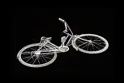 In his haunting installation, High Water, at Toronto's Nuit Blanche 2012, "ghostly objects float on the surface of a small pond in the shadow of Roy Thompson Hall, like lost possessions after a disaster - a baby onesie, a bicycle, a gas canister".[17] Gill then captured the eerie scene in series of photographs. Bicycle/Leaf (2013) is one such image.