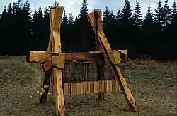 "Interestingly, Gill never cuts a tree for his sculptures; instead, he recycles and reclaims fallen trees and dead wood that he finds in the forest or salvages from building demolition sites. An example of such recycling is the wood coming from the infamous Mount Cashel orphanage ground. The main building was levelled four years ago, many years after the scandal of sexual and physical child-abuses by Christian Brothers. Trees were also cut down to put up a supermarket. The maple the artist recovered from the site is found in his work titled Workhorse (1998), permanently installed at the Boreal Sculpture Park in St. John's. Hanging from the maple beam are some 500 rectangular pieces of birch on bronze rods. While the birch and bronze elements reflect each other by their similarity in size and shape, these two parts of the sculpture present opposing qualities. The marks left by the chainsaw stand as witness of the artist's intentions while conferring roughness, solidity, and strength to the piece. In contrast, the mirror image hung on bronze rods that is animated when the wind blows is delicate and lyrical in feeling."[10]