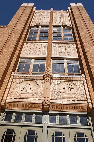 On September 6, 2007, the Will Rogers High School building was added to the National Register of Historic Places with national significance.[5] It is an example of Art Deco. The National Park Service has stated that it is one of the best examples of Art Deco high school architecture in the United States.[6]
