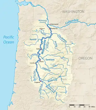 ![]() A map of the Willamette River, its drainage basin, major tributaries and major cities | |