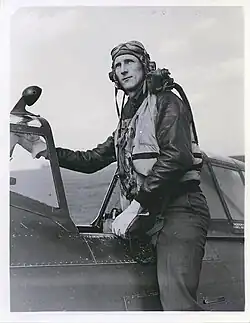 In 1941, he enlisted in the U.S. Army Air Corps as an aviation cadet at Fort Leavenworth in Kansas. He served as an aviation cadet until October 1941 when he accepted a discharge after failing to pass flight checks. He enlisted in the Royal Air Force at Tulsa, Oklahoma, where he earned his pilot wings and assigned as a Flying Sergeant. Stationed in England, he flew combat missions in Hawker Hurricane and Supermarine Spitfire fighters with the No. 133 Squadron.[2][1][3]