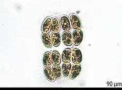 Willea consists of four-celled (rarely two-celled) colonies (termed coenobia); the coenobia may be aggregated to form compound colonies of 100 cells or more, arranged in a single plane. The cells are oval to cylindrical, arranged in a rectangle forming a rhomboidal gap. The cell walls are smooth. Cells are uninucleate, and contain a single parietal chloroplast; the chloroplast has a pyrenoid but this may be difficult to observe.[1] Asexual reproduction occurs by the formation of autospores, which are organized into coenobia; they enlarge with the cell wall, which eventually dissolves, releasing the new cells. Sexual reproduction and flagellated stages are not known in this genus.[1]