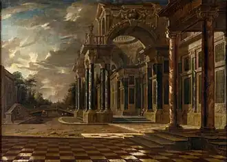 The majority of his known works show imaginary architecture which serves as the setting for scenes with elegant figures dancing or enjoying a masquerade. An example are the pair of Masquerades in the Moravian Gallery in Brno. In one of the two, figures are shown in an impressive open colonnaded hall which appears to be set in a park. The exaggerated perspective of the architecture draws in the eye of the viewer. The fantastic architecture comprises marble columns decorated with statues, garlands and draperies. It serves as the stage for the entertainment of noble ladies and men in fanciful costumes who are seen dancing to the tunes of music or sitting around tables. Some form of performance also seems to be on process. At the back is an elevated balcony from which viewers are watching the people below. These types of pictures served as decorations for palaces. They played on the interaction between the real and the illusionary palaces and were popular with the elites at the time.[8]