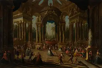 An early Flemish painting tradition of depicting ball scenes had been developed by the Antwerp painter Hieronymus Janssens, who himself may have been inspired by Rubens' garden of love paintings.[9] The painter Jacobus Ferdinandus Saey regularly painted the fantastic architecture for Hieronymus Janssens' ball scenes.[10] Antwerp painter Jacob Balthasar Peeters, whose work must have been familiar to van Minderhout as he was a pupil of his father, also painted fantastic architectures with elegant figures in exotic costumes.[11] In addition to these homegrown sources, van Minderhout may also have drawn inspiration for his masquerade pictures from Claude Gillot's prints of comedia dell'arte scenes, and the work of the Flemish painter Hendrick Govaerts from Antwerp, who was also active in Central Europe.[8]