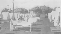 In 1918, Brooks sent letters urging for more hospital facilities, with the Spanish flu pandemic and injuries from the war placing a strain on the services.[95] As the pandemic worsened, he began devoting all his time to supervision of hospitals and studying the disease.[94] By September, Brooks, who had also been named a medical director for the United States Shipping Board, had established at Corey Hill an emergency tent hospital, believing through his studies that sunshine and fresh air were the most effective at combating the virus.[4][94] The Camp Brooks Open Air Hospital, as it was known, consisted of 13 tents, all but one of which were occupied by 1–2 patients and the other by the head nurse.[96] The hospital took 351 patients from the 1,200 sick among the merchant sailors in the East Boston harbor, receiving many of the worst cases.[96] A later article from the American Journal of Public Health described its conditions:
