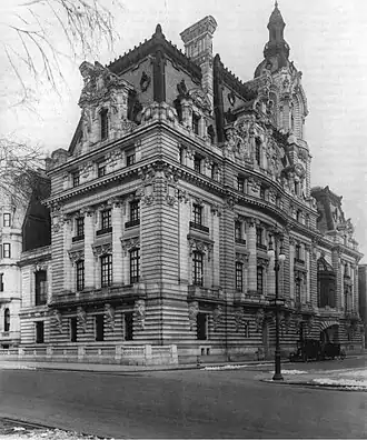 On 77th Street, the house featured a long facade rising to a steep mansard roof. The mansion featured a spectacular four-sided tower with a three-story-high inward-curving arch topped by an open pergola[3] that was said to have been visible from almost anywhere in Central Park.[4]