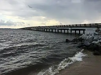 The William B. Umstead Bridge is a two-lane automobile bridge spanning the Croatan Sound, between Manns Harbor and Roanoke Island, in Dare County, North Carolina. The bridge carries US 64 and is utilized by local and seasonal tourist traffic. The bridge speed limit is 55 miles per hour (89 km/h), except during the months of July and August when it will drop to 20 miles per hour (32 km/h) during dusk and dawn; the west end of the bridge becomes home of more than hundred-thousand purple martins as they prepare for their annual migration to Brazil.[3]