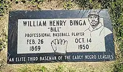 Binga was buried in an unmarked grave in Minneapolis, Minnesota, where his grave remained unmarked for more than 63 years. He received a proper headstone for the first time in June 2014 from the Negro Leagues Baseball Grave Marker Project.[17] His death records show he was married, to Edna Louise, and his parents were Joshua and Lucy Binga.[18] According to the 1940 Census, Binga's wife had died.[19]