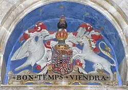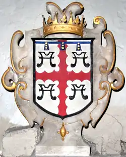 - ^ These 10 quarterings are also visible in stained glass in the cloister of Hengrave Hall, Suffolk: Bourchier, Louvaine, FitzWarin, Audley, Cogan, Hankford, Stapledon, Martin, Dinham, Arches, all impaling Donnington (Argent, three pallets azure on a chief gules three bezants), the third wife of the 2nd Earl.[1]