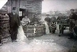 "Mr. Bradbery now having left Northfleet last year (1820), began to plant, at a considerable personal expense, beds of the cress, at West Hyde, near Rickmansworth, Hertfordshire. Mr. Bradbery has about five acres of lakes planted with cress. He sends the cress in hampers, each containing eight dozen bunches, to the London markets, every day throughout the year, except Sundays; three days in each week to Covent Garden market, and the other three days to Newgate market. This cultivation of the watercress has insured a constant and regular supply to the metropolis, and the gatherings are received much fresher, and more regularly packed, than those obtained from plants in the wild state; where little selection is made as to the quality, or attention paid to the state of the vegetable, which is usually sent up to town in sacks, and often much bruised and broken before it reaches the retail dealer".[3]