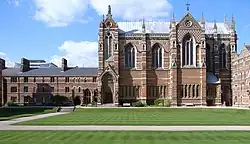 At Oxford, Butterfield designed Keble College, in a style radically divergent from the university's existing traditions of Gothic architecture, its walls boldly striped with various colours of brick. Intended for clerical students, it was largely built in 1868–70, on a fairly domestic scale, with a more monumental chapel of 1873–6. In his buildings of 1868–72 at Rugby School, the polychromy is even more brash.[2]