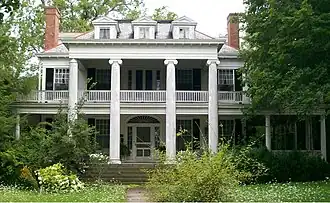 The 2+1⁄2-story wooden-frame house rises from its lot with the main entrance facing north. The entrance is reached by a small flight of stairs and is flanked by four colossal Ionic columns and a 2-story veranda. The front door is surrounded by transom windows on either side and a large fan light with wooden spokes. The door sits in between two windows on either side; each window is a 12/1 sash with dark black shutters.