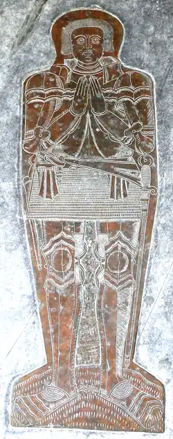 Cary was beheaded on 6 May 1471[1] after the defeat of the Lancastrians at the Battle of Tewkesbury.[2] He is believed to be represented by a monumental brass of a knight, without surviving identifying inscription, set into a slate ledger stone on the floor of the chancel of All Saints Church, Clovelly, next to a smaller brass, in similar style, of his son and heir Robert Cary (died 1540).[1]