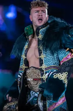Ospreay returned to RevPro, for the first time since losing his title at Revpro Uprising 2022 in December, defeating Tomohiro Ishii.[38] Ospreay made sporadic appearances for RevPro for the remainder of 2023, defeating the likes of Big Damo, Luke Jacobs and Eddie Dennis. Ospreay had a standout match on 9 July at RevPro Epic Encounter, defeating Leon Slater.[39] On 26 August, at RevPro 11th Anniversary Show, Ospreay defeated Shingo Takagi, ahead of his match against Chris Jericho at All Elite Wrestling's (AEW) All In at Wembley Stadium, leading to Jericho making an appearance at the show and attacking Ospreay.[40] At RevPro Uprising on 16 December, Ospreay defeated Gabe Kidd.[41] Following the match, Ospreay announced that ahead of his recent signing to AEW, 18 February 2024 would be his final RevPro event.[42] On 18 February, Ospreay unsuccessfully challenged Michael Oku for the Undisputed British Heavyweight Championship at High Stakes, this marked Ospreay's final appearance for RevPro.[43]