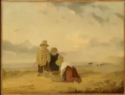 In 1820, Collins was elected a Royal Academician (RA), presenting as his diploma picture The Young Anglers. In 1822 he married Harriet Geddes, sister of the portrait painter Margaret Sarah Carpenter. He continued to exhibit with popularity and travel in England and Scotland. In 1826 he painted The Fisherman's Departure, (engraved by Phelps), and in 1828 made a tour of the Netherlands and Belgium, living for short time in Boulogne in 1836. Rustic Hospitality was painted in 1834 and in 1836 Sunday Morning and As Happy as a King, the subject of the latter being suggested to Collins by the story of a country boy whose ideal of regal happiness was swinging on a gate all day and eating fat bacon.[1] Collins painted several works with children as the primary focus, including Children on a Mountain Top (1846), with his earliest examples featuring a color palette closer to tonalism decades before the movement's rise to popularity in the 1880s.