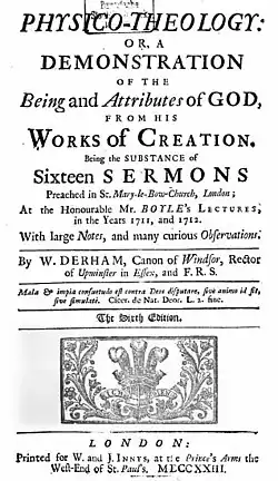 - ^ a b c d One or more of the preceding sentences incorporates text from a publication now in the public domain: Chisholm, Hugh, ed. (1911). "Derham, William". Encyclopædia Britannica. Vol. 8 (11th ed.). Cambridge University Press. pp. 73–74.