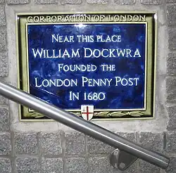 William Dockwra (c. 1635–1716) was an English merchant who along with his partner Robert Murray created the first Penny Post in London in 1680. In latter 17th century London there was no official postal system for mail delivery within the city of London and its suburbs. Dockwra's London Penny Post was a mail delivery system that fulfilled this need. His system worked so well that it compromised the interests of private couriers and porters and royal officials alike.[1][2][3]