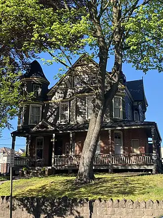 A rear addition was erected circa 1910. It has a stone foundation, brick first story, and wood shingle second and third stories. It features irregular massing, a variety of surface textures, multiple intersecting roofs, bay windows, porch and balconies, and a turret with spindle. The house was converted to apartments in 1925.[3]