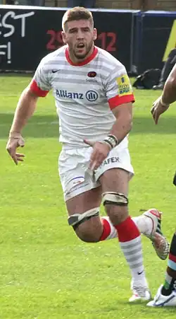 Fraser cemented his place in the side during the 2012–13 season and by January had accumulated more minutes on the pitch than anyone bar captain Steve Borthwick.[12] In the same month he was among 10 players who signed extensions to their contracts with Saracens.[13] He played 19 Premiership games and started all seven of Saracens Heineken Cup matches before tearing a tendon off the bone in his shoulder against Gloucester Rugby in April 2013.[6][14] The injury ruled him out of Saracens' Premiership and Heineken Cup semi-final defeats, as well the possibility of selection for the England tour of Argentina.[15]