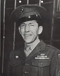 Completing his recruit training at Marine Corps Recruit Depot San Diego, California, he was temporarily in the 1st Guard Company at that base, prior to his transfer to Headquarters and Service Company, 2nd Battalion, Camp Elliott, San Diego, California, in September 1942. He was promoted to private first class upon his arrival at Camp Elliott, and while there was later advanced to corporal.