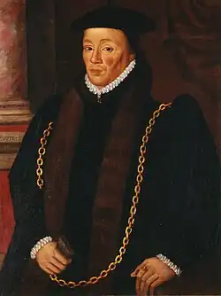 All these received pardons, but several others were tortured, condemned and executed.[34] Sir Anthony Kingston is thought to have taken his own life in April, and Edward Lewknor, condemned with Francis Verney on 9 June, died a prisoner in the Tower of London in September.[35] The monarch's suspicions were more generally aroused, and in November 1556 Garrard sat with Thomas Offley (then Lord Mayor), Martin Bowes and Ralph Cholmley, at the indictment of Sir John Braye, 2nd Baron Braye, who had failed in his duty of respect to the sovereign upon the day of coronation by voicing the wish that Elizabeth were reigning instead.[36]